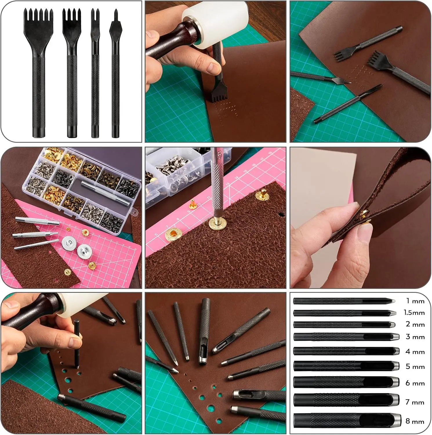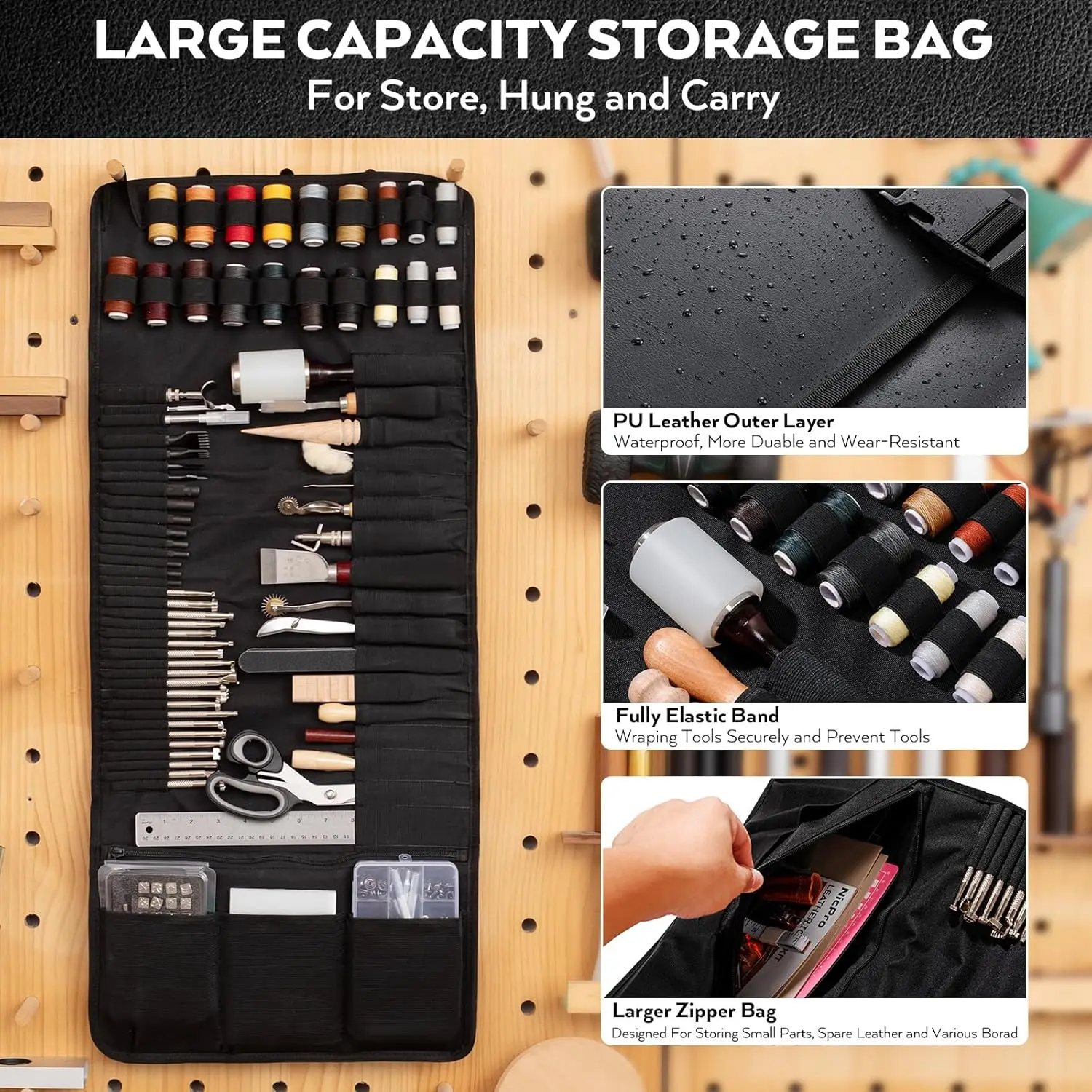 Complete leather crafting toolkit with 160 essential tools for stamping, sewing, carving, and punching. Features premium wax and sewing threads, professional-grade stamps, hollow punches, carving knives, and protective mats. Includes durable waterproof storage bag (33.5x14.6 inches) with elastic bands and zippered compartments. Ideal for beginners and experienced crafters working on wallets, handbags, belts, and more. Everything you need to start creating beautiful leather goods in one organized, ready-to-use collection.
